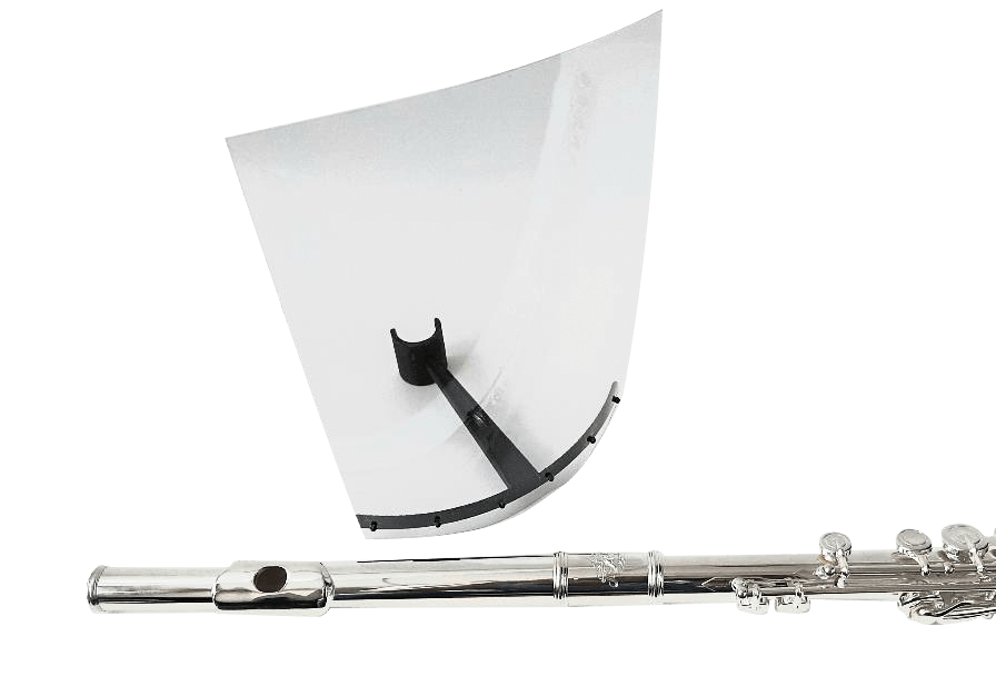 Pantallas protectoras para flautas traveseras. Han sido diseñadas y fabricadas por nuestro taller de viento para minimizar la emisión de gotículas al tocar. Es fácil de poner y quitar, regulable para facilitar la visibilidad y de rápida desinfección.